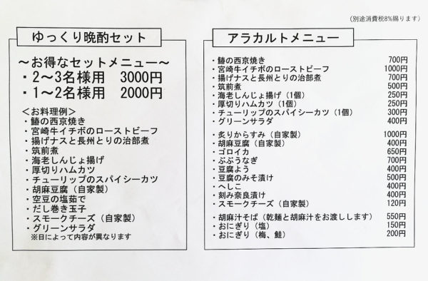 テイクアウトできるのは、お得な『ゆっくり晩酌セット』で、2~3人用が3000円、1~2人用が2000円となっている。鰆の西京焼きや宮崎牛イチボのローストビーフ、揚げ茄子と長州鳥の治部煮、筑前煮、海老しんじょ揚げ、厚切りハムカツ、チューリップのスパイシーカツ、胡麻豆腐(自家製)、空豆の塩茹で、スモークチーズ(自家製)、グリーンサラダなどが入っている(日によって内容は異なる)。『アラカルトメニュー』からの注文も可能。