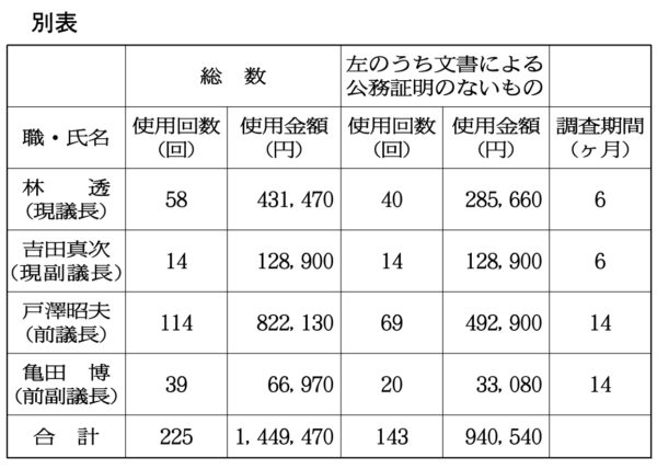 どれほどのタクシー代が使われているかについては、別表のとおりです。わずかな期間の調査ですが、4人で225回、約145万円と、使用回数も多く、金額も多額です。このうちの143回分、94万540円が公務にともなって使用したという確認がとれず、私的な飲み会帰りの使用ではないかと監査請求を受けたものです。
