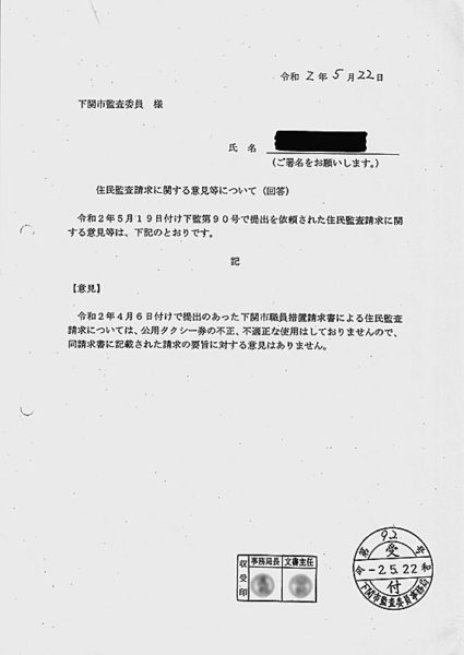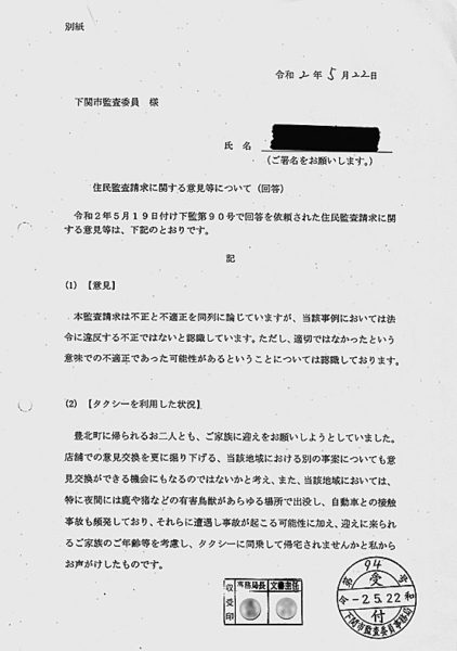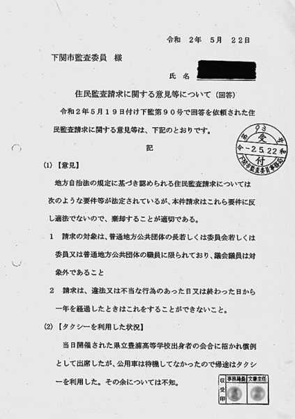 令和2年6月3日、監査結果の通知文書「下関市職員措置請求に係る監査結果について」を受けとった。