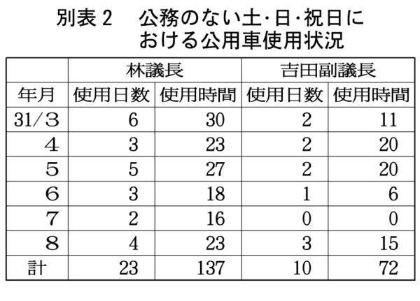 別表2で分かるとおり、調査した6カ月間に、市役所での公務がない土、日、祝日に、公務で使ったという証明もないのに林議長は23日間、吉田副議長は10日間それぞれ公用車を使っている(運転している)。市役所は閉まっている土、日、祝日に公用車を使ってどこに行ったのか、何の公務があったのか分からない。その他にも、ここには表示していないが、平日の19時以降の使用で、公務に使ったことが証明できない使用が、林議長は28日間で87時間、吉田副議長は、50日間で202時間もある。また、この他にも公務証明のない早朝の使用があるが省略した。なお、戸澤、亀田前正副議長の公用車使用状況は調査していない。