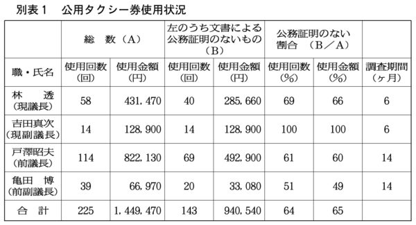4人の平均値を見ると、公用タクシー券を使用した全部のうち、回数で143回(64%)、金額で94万540円(65%分)は公務証明がなく、私用で使ったのではないかと思われる状況である。吉田副議長にいたっては公用タクシー券使用分の全部が、公務証明がない使用となっている。公務証明が漏れているものがあったにしても、ひどい使用の実態である。