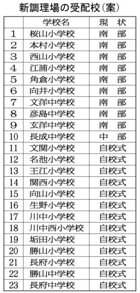 これまでに、新施設はHACCP対応の施設とすることなど、おおまかな基準や、新調理場が担当する学校(受配校)案などが示されている。南部調理場で供給してきた9校に加えて旧市内の自校方式13校を集約するほか、中部学校給食調理場(新下関市場そば)から提供している学校のうち1校を加えた計23校を対象とする予定だ【表参照】。