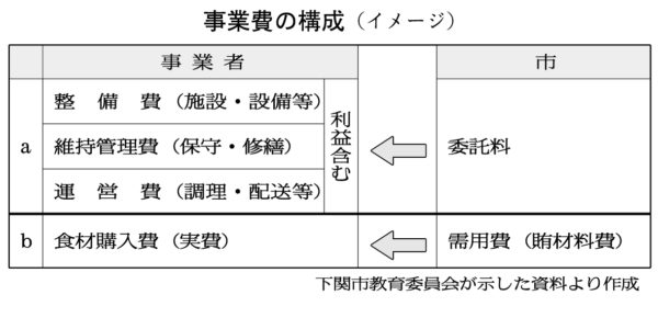 15年間の契約で総事業費は上限100億円。市教育委員会によると、建設までは民間事業者が資金を調達しておこない、運用開始後に整備費(建設費)や維持管理費、運営費を毎年市が支払っていく形になるという。食材費はこれとは別枠にして保護者から徴収した給食費から支払う【図参照】。建物の所有は民間事業者となり、公共施設ではないため、文科省の補助金は申請していないほか、自由度が高まるよう仕様も細かく定めないという。裏返すと学校給食に市教委が責任を持たない体制に移行するということでもある。