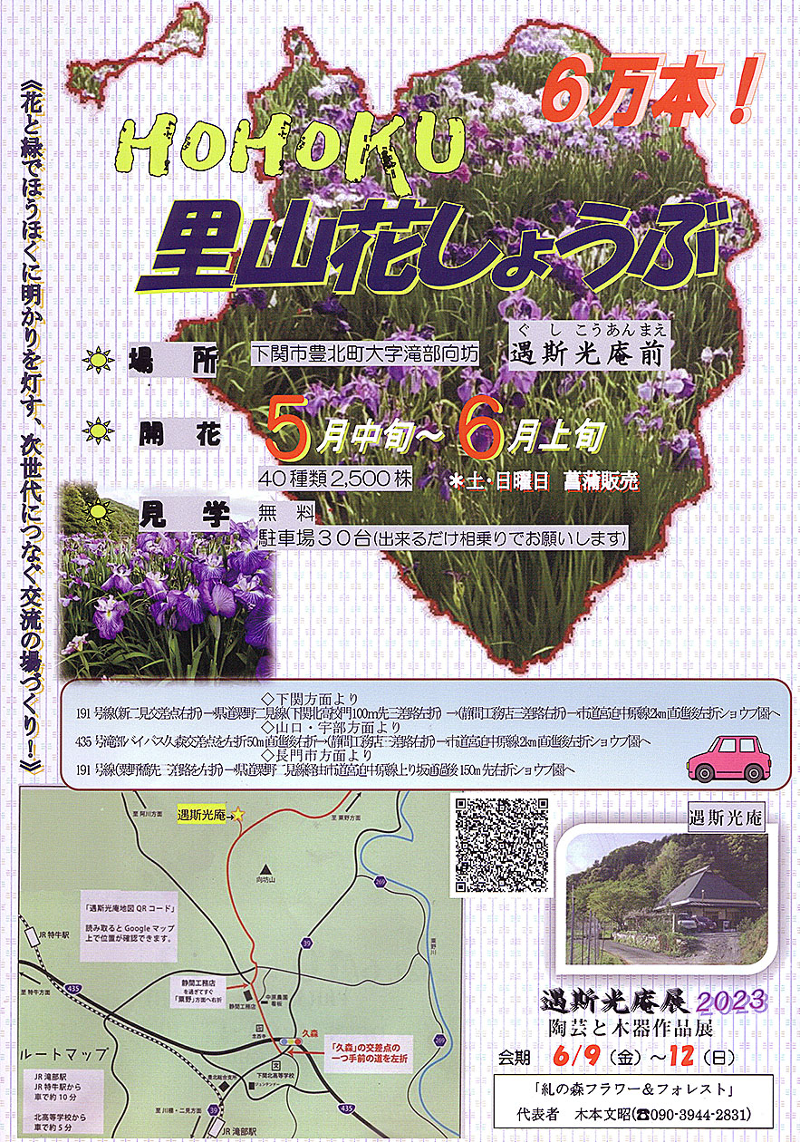 下関市豊北町滝部向坊(滝部5042)の地域交流施設・遇斯光庵(ぐしこうあん)前の農地で、約2500株(約6万本)の里山花しょうぶが開花を控えている。花しょうぶの披露は今年で7年目で、豊北地区の活性化と地域交流の場づくりのために、遇斯光庵の代表者である木本文昭氏をはじめ日ごろから豊北町の活性化を目指して活動している住民有志が準備してきた。当初は120株だったが、株分けをくり返し2500株まで増え、この時期約6万本が一斉に咲き誇る。
