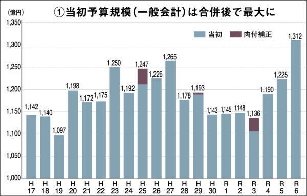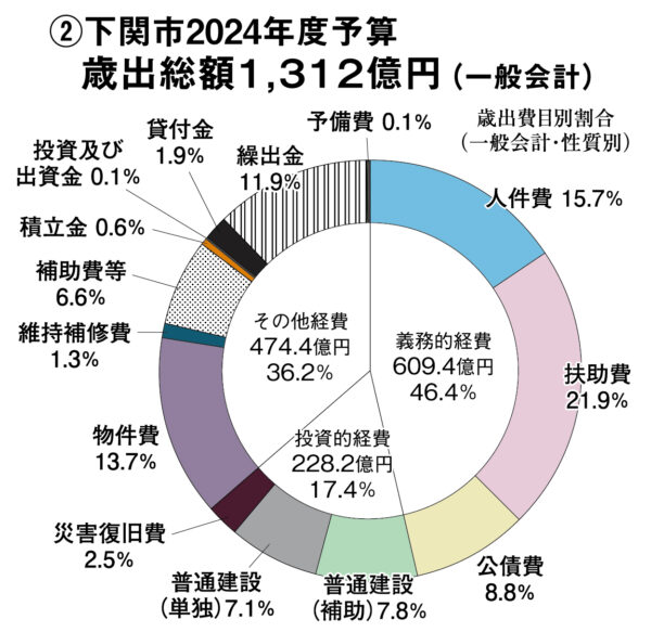 A 一般会計の総額は1312億円で、前年度比約87億円(7・1%)増と大幅な増加となった。これは比較可能な1市4町が合併した2005(平成17)年以降で最大の予算だ【グラフ①参照】。今回の予算は「For Kids For Future~セカンド・ステージ」予算なのだそうだ。ちょっと何を言っているのかわからないのだが、前田市長は「これから下関はさまざまな事業が形をなし、魅力と活気にあふれ、賑わいに満ちた新しい景色があらわれる」といっている。最近、あちこちの行事などに顔を出しているが、その姿を見た人たちは「すでに当選確実という顔をしている」と話題にしている。次期市長ポストについて林派にもお墨付きをもらって、競争相手も牽制して、もう自信満々なのだろうと話題になっていたが、今回の大型予算もその自信の根拠の一つなのだろう。