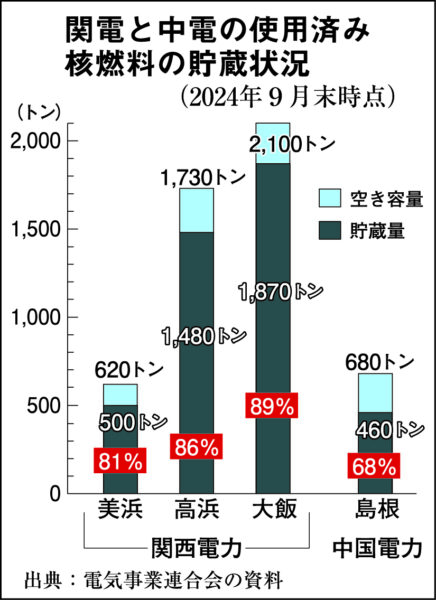 名目はあくまで「地域振興策」だが、実際に中間貯蔵施設を早急に必要としているのは上関町でも中電でもなく、関電であることは誰の目にも明らかだ。関電管内で稼働中の美浜、高浜、大飯の3原発内に貯蔵されている使用済み核燃料は、どこも許容量の80%以上に達しており、早ければ2~3年以内に上限に達するといわれている【図参照】。