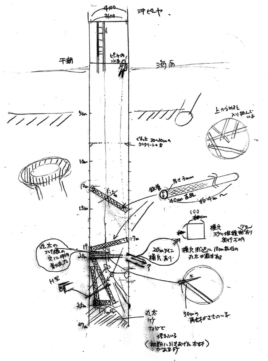 調査で判明した沖側のピーヤ内部を描いた図。深部に多くの堆積物がある(刻む会提供)
