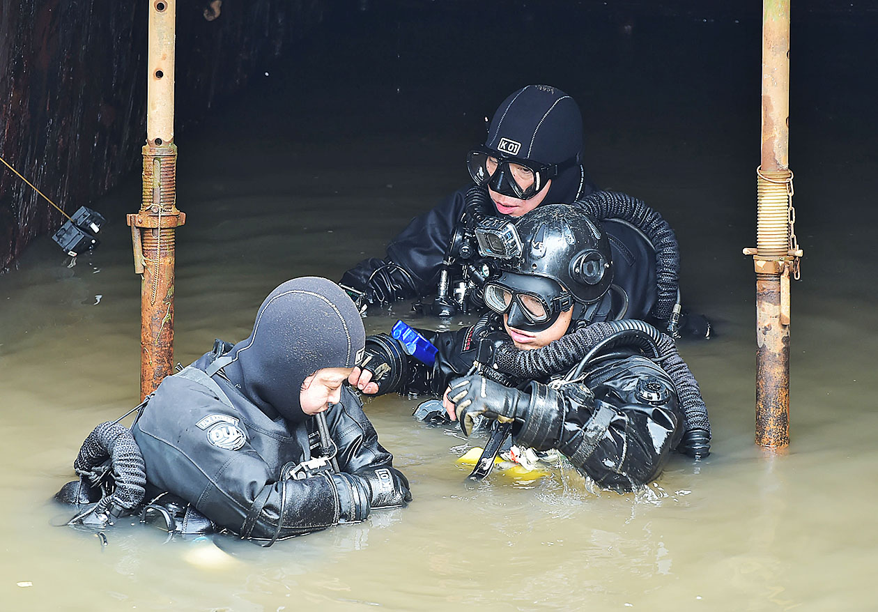 海底炭鉱である長生炭鉱坑道で潜水調査をおこなう日本と韓国のプロ・ダイバーたち(4月1日、宇部市床波)