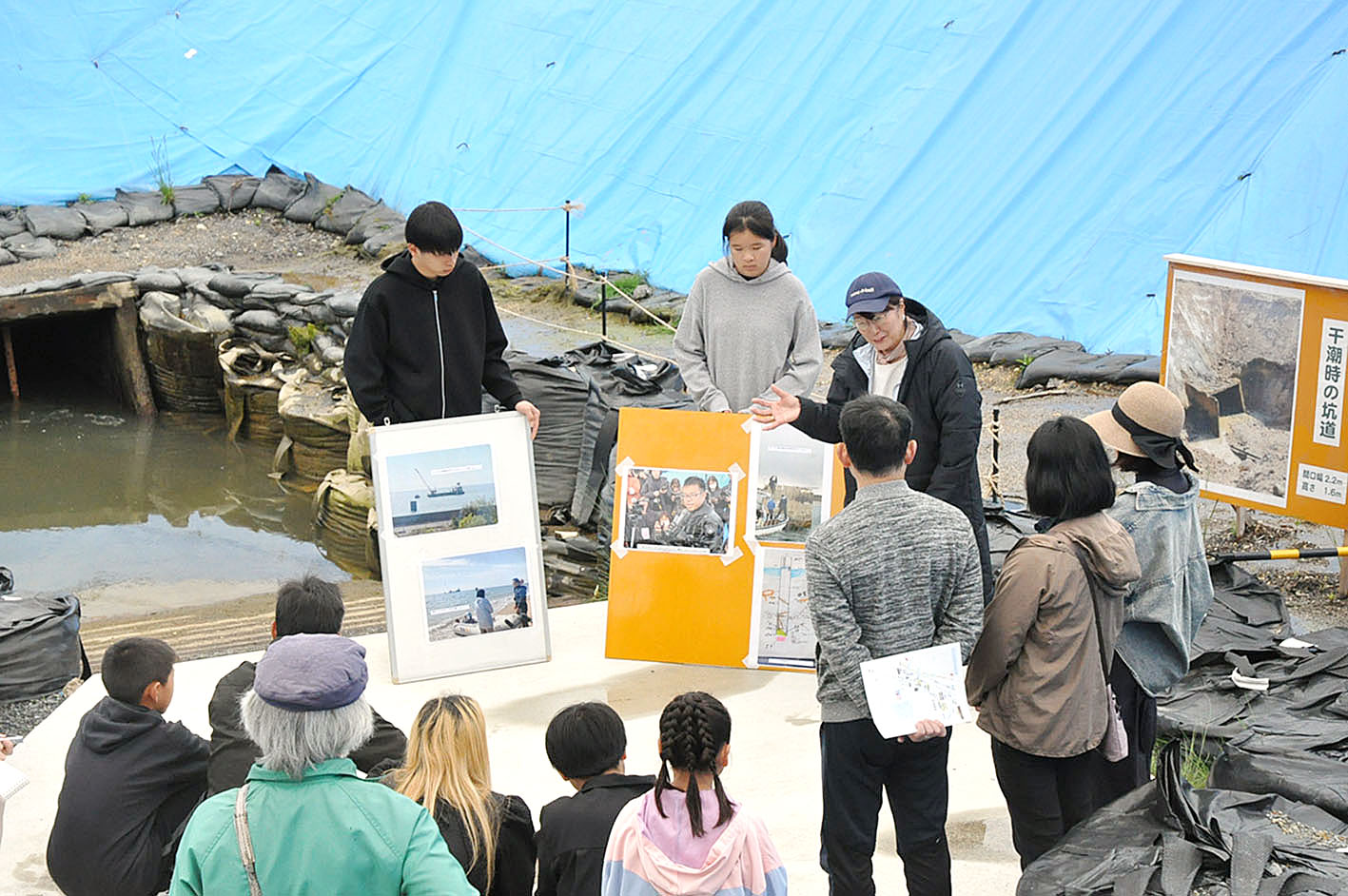 長生炭鉱の抗口前で説明を聞く参加者たち(六日)