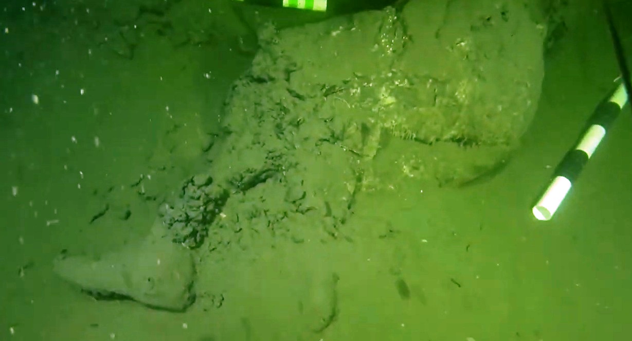 長生炭鉱坑道内の映像に映る犠牲者の遺体。遺骨は衣服や靴を着用しているのがわかる(刻む会提供)