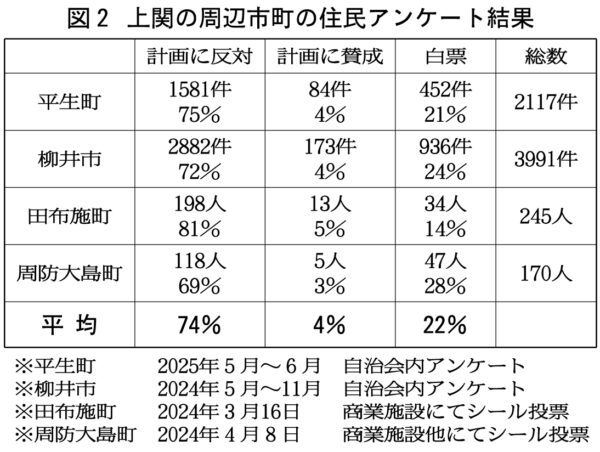 また、上関町内のみならず周辺市町の住民の間では、核燃料サイクルの破綻が明白であるなか「中間貯蔵施設というが、実質最終処分場ではないか」との世論が圧倒的だ。計画が浮上して以降、それぞれの市町では地元住民が主体となって反対署名や住民アンケートがとりくまれ、どの市町もアンケートでは七割をこえる住民が反対の意志を示している【図2参照】。そうした世論を代表して山口県や地元首長や議会に対して、反対を表明するよう求める要望書や請願の提出もあいついでいる。