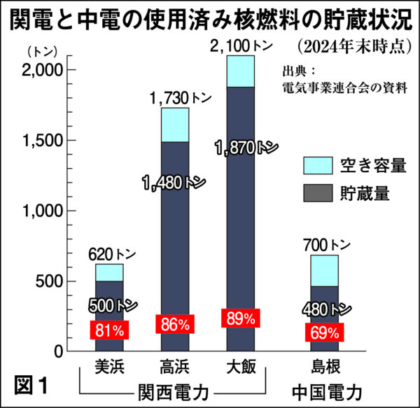 関電管内で現在稼働している大飯、高浜、美浜の3原発内に貯蔵されている使用済み核燃料は、すべて許容量の80%をこえており、早ければ2~3年で上限に達するといわれている。県外に搬出できず満杯となれば、関電は運転停止に追い込まれる可能性がある【図1参照】。