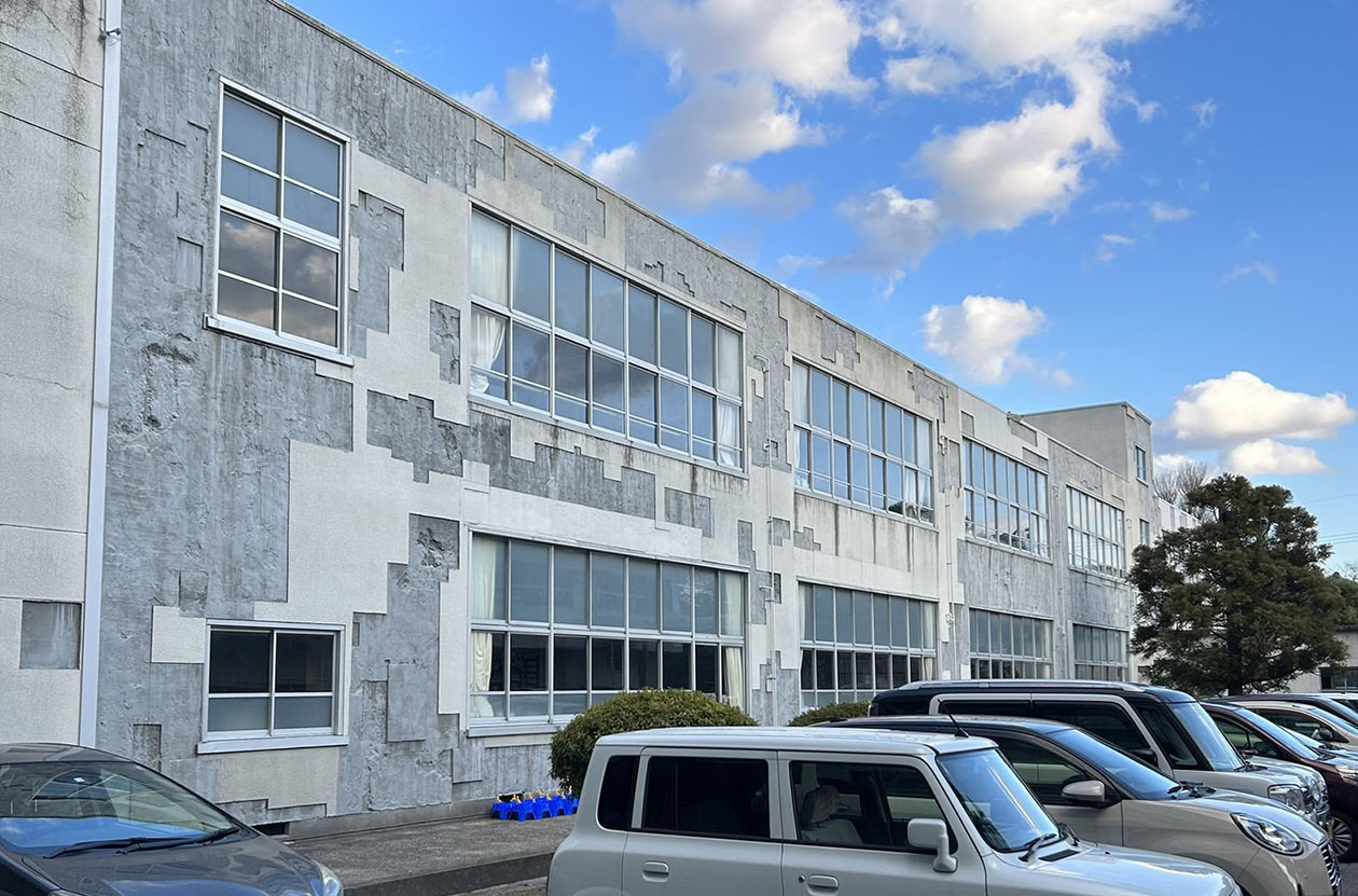 築72年の豊浦小学校校舎。外壁の剥落し、残っている面積の方が少ない(下関市)