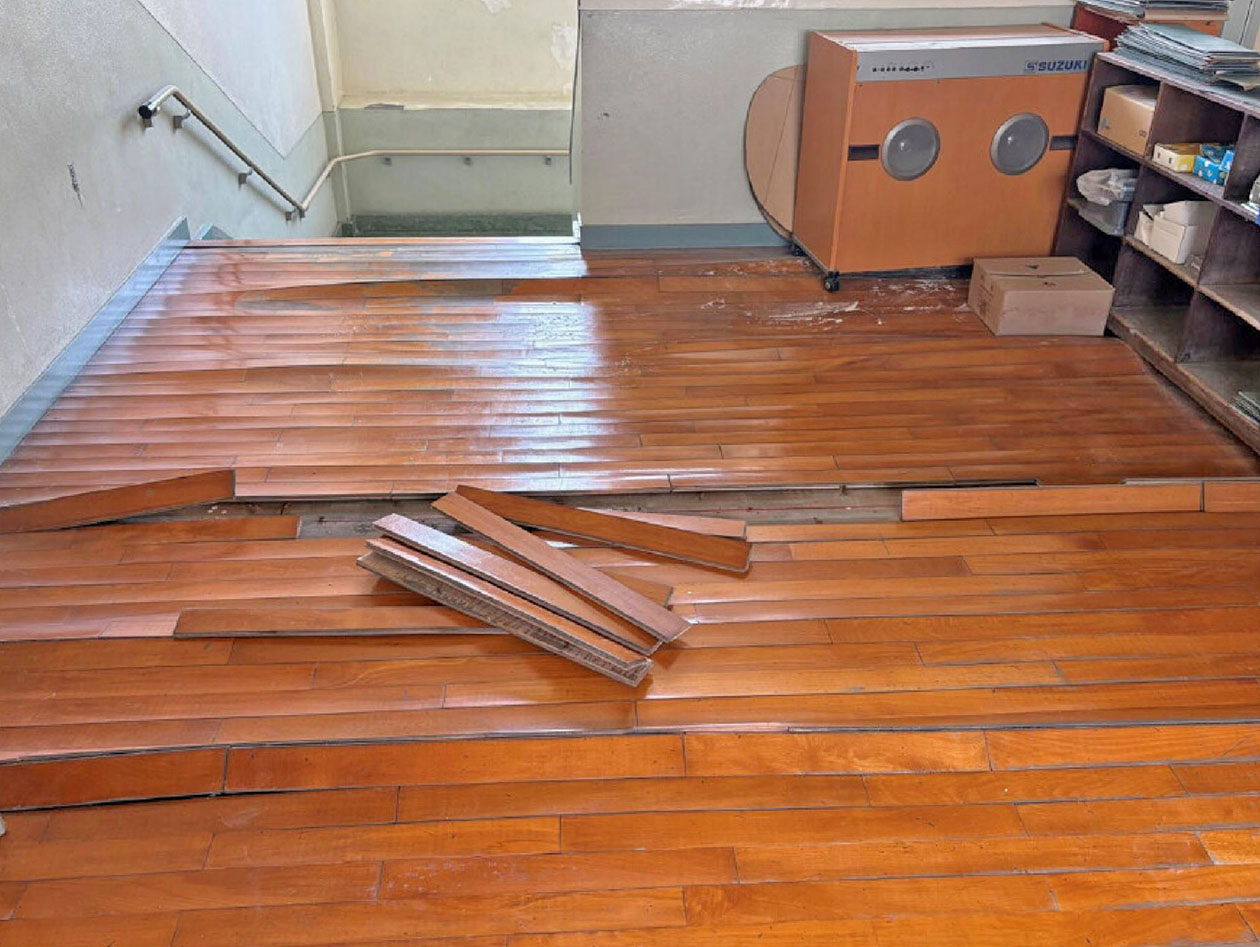 雨水を吸ってバラバラになった2階踊り場の床(宮野市議が9月議会で示した被害写真)