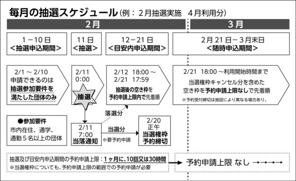 B 例えば4月の利用を決めることを例にとると【表参照】、2月1日~10日が「抽選申し込み期間」で、抽選日は11日。ここで当選すれば予約申請を20日までにおこなって「予約」をとる。落選すれば翌12日~21日までの間は抽選後の空き枠に申し込み、「1カ月10回、又は30時間」の上限枠内で予約ができるが、これは先着順だ。さらに、21日18時以降はキャンセル分を含めた空き枠を、上限なしで利用当日の開始時間までいつでも予約することができる、といったものだ。要するに、1カ月中、拘束されたあげく、今まで拠点にしてきた練習場所が確保できるかどうかは運次第になるということだ。