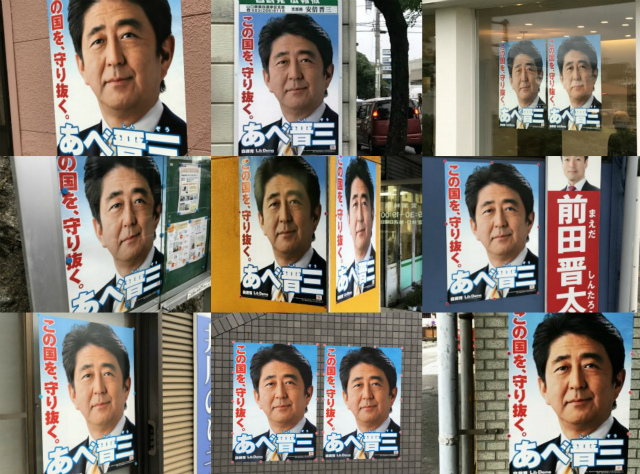 公示後、安倍事務所によって下関市内にはりめぐらされた安倍晋三ポスター(13日)