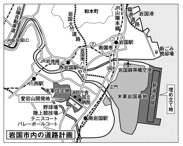 A この10年余り岩国ではいっきに都市改造が進み、街は景観も含めて様変わりしている。基地は沖合にもう1本滑走路ができて倍ぐらいになった印象だ。戦斗機の格納庫も沖に移してつくり直し、新しい管制塔もでき、その他の建物もみな沖に移動させて新しくつくり直している。そして基地内の手前側には住宅や兵舎をたくさんつくっている。古い物はみな建て替えた。愛宕山では、1戸につき約100坪もある将校用の住宅260戸が建設中で、住宅の周囲をフェンスで囲っている。基地が沖合拡張しただけでなく、愛宕山も米軍に接収されたといっていい。岩国駅前から西岩国に向かう途中には、基地に向けて新しい道路がズドーンと走っている。でき上がったのは、まさに極東最大の軍事要塞だ。通勤・通学道路は50年前と同じで、車が行き交うのも難しく、そこを中・高校生が自転車で通学する危険性は昔からいわれているが何も変わっていない。基地のためだけにカネが注ぎ込まれ、巨大道路群も含めて「すべての道は米軍基地へ」がやられている。米軍仕様の街作りだ。「基地の街」ではなく「街が基地」になろうとしている。