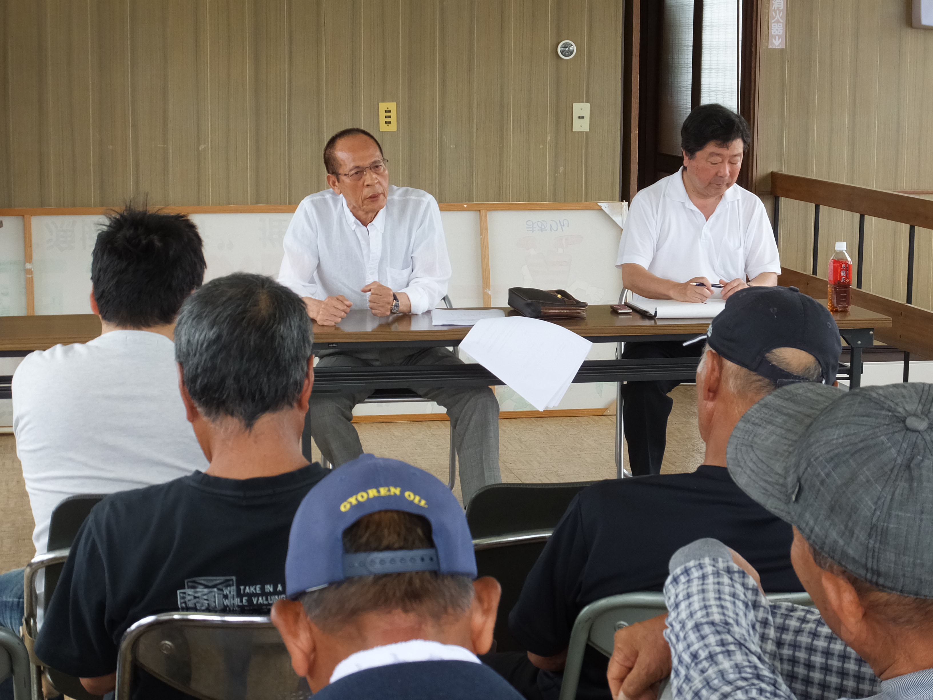 下関ひびき支店に来て「海の調査を妨害しなければ1人100万円出す」という廣田氏(左、2015年7月)