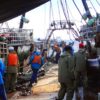 漁船の乗組員は1艘に10人ほどが乗り込む。1艘の船が網のロープを一本ずつ引き、この状態でだいたい1時間半から2時間、狙った海底のポイントで網を引く。夜は睡眠時間をとるために網を引く時間を延長して3時間ほど引く場合もあるという。網を引き上げる時は、片船ずつロープを巻きながら船同士の間隔を狭めていき、最後は一方の船が巻き上げたロープを片船に託し、最後はロープ2本ともを1艘の船で巻き上げて網を回収する。引き上げてきた網から魚を船上で選別、発泡スチロールに箱詰めし、船内の冷蔵庫に保管していく。この選別の作業がもっとも大変な仕事だといわれている。一連の流れを沖に出てから市場へ帰るまでの間、くり返しおこなう。かなりの肉体労働だ。