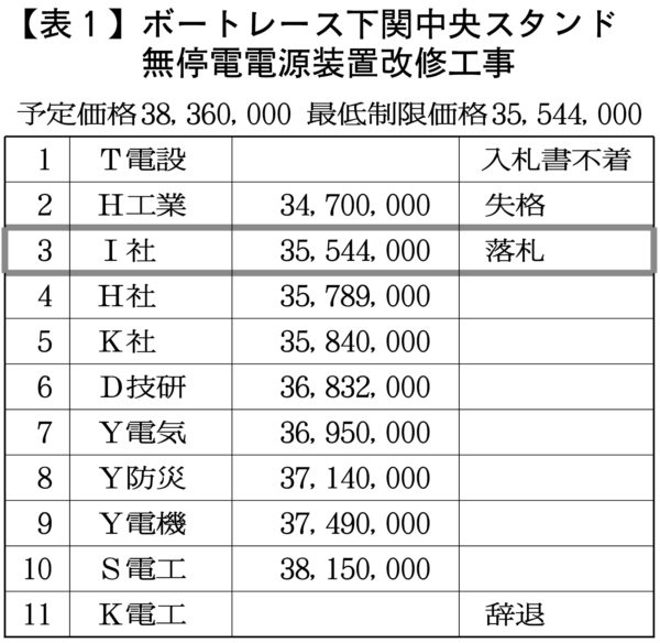 一旦入札中止になったこの工事は10月3日、別の工事を付け加えた形で再入札がおこなわれた。それが「ボートレース下関中央スタンド監視カメラ・無停電電源設備改修工事」の入札で、今度は条件付き一般競争入札でおこなわれた。予定価格6850万円、最低制限価格6377万7000円(いずれも税抜き)の大規模な工事だ。ところがこの仕切り直しの入札で、またもやI社が最低制限価格どんぴしゃの数字を入れ、落札した。