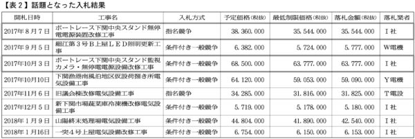 2度にわたってどんぴしゃをたたき出したのはI社だが、業界内ではI社と組んだ数社が仕事を融通しあっているのだという噂が広まり、最低制限価格に近い金額で落札しているいくつかの入札結果に疑問の目が向けられている【表2】。その不思議さから、かりに入札情報が漏洩していたとすれば、どのルートが考えられるのか調査していた人たちもいたようだ。この事件が発端となって業者間に亀裂が入り、業界でつくる電気安全協議会は解散になった。