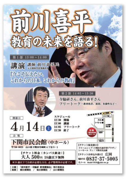 下関市民会館で14日(土)午後1時から、「前川喜平 教育の未来を語る!」と題する講演会が開催される(主催/「前川喜平・寺脇研 教育講演会」実行委員会)。目下、チラシやポスター等で告知されるなかで、市内で話題を集め、チケットが次次に買い求められている。主催者の予想に反して反響が広がっているため、会場を当初予定していた中ホール(400席)から大ホール(1469席)に変更するなど、取り組みが勢いを見せている。