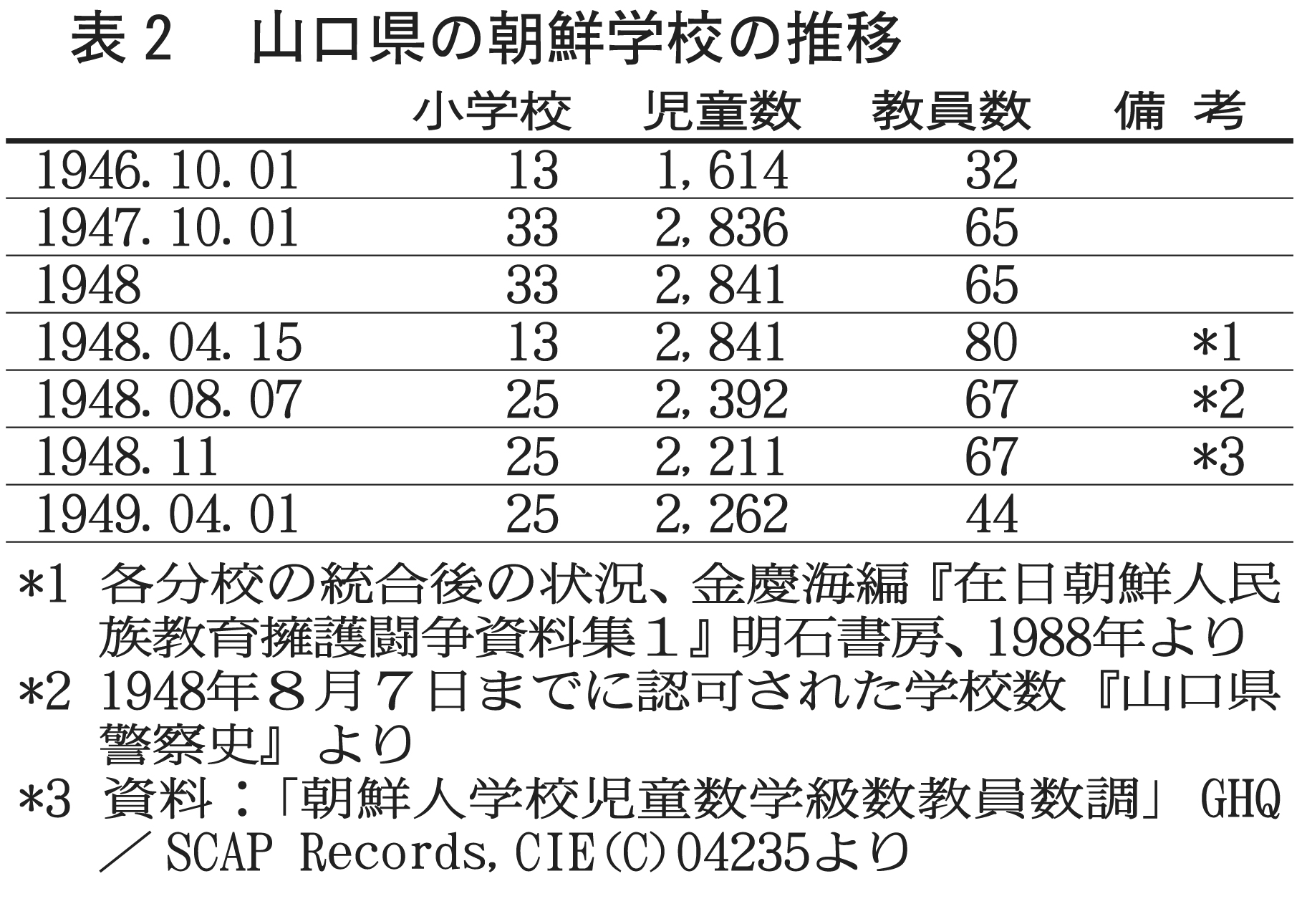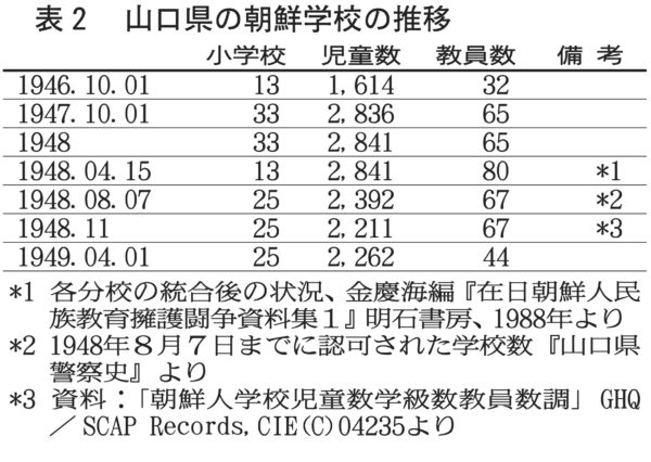 山口県でも、県内に何十ヵ所とあった国語講習所が、朝連初等学校へと改編されていった。1947年の10月までに33校の初等学校が設立され、2836人の児童が通っていた(表2)。朝鮮語(国語)、歴史、公民、地理、算数、理科、音楽、体育、日本語などが教えられ、国語講習所で教えていた講師のうち、比較的若い者が教壇に立った。朝連では、教員の質的な向上を図るために朝連中央師範学校を設置し、夏休みを利用した夏期講習会を全国各地で実施している。