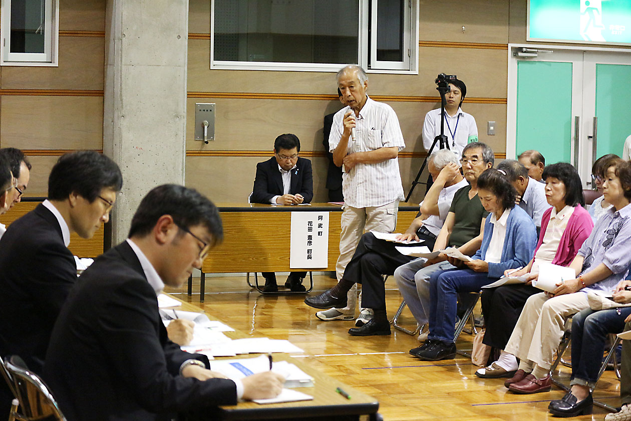 中四国防衛局職員に意見を述べる住民(17日、阿武町福賀)