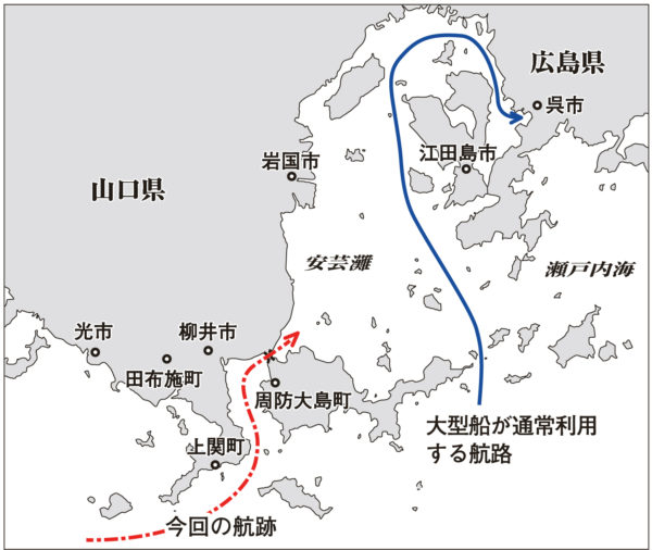 瀬戸内海は、潮汐の干満差が大きく、水道も狭く地形が複雑なため、全国で最も潮流が速い海域として知られている。とくに事故現場となった大畠瀬戸は、大島大橋の下を通過しなければならないうえに海峡の幅も狭く、漁船も含め1日あたり124隻が行きかうが、最大でも4000㌧クラス(平成26年度)。3000㌧クラスの内航船タンカーでも自主規制を敷いて「航行不可」とし、周防大島の東側にある諸島水道(情島と津和地島の間)のルートを使うといわれる。2万㌧をこえる大型船の場合は、さらに東側のクダコ水道(愛媛県の中島と怒和島の間)を主要な航路としている。2万5000㌧をこえる大型貨物船が通れる海域ではないことは、海運業に携わる人人の間では常識であり、「ありえない」「前代未聞の事故」と驚きをもって語られている。
