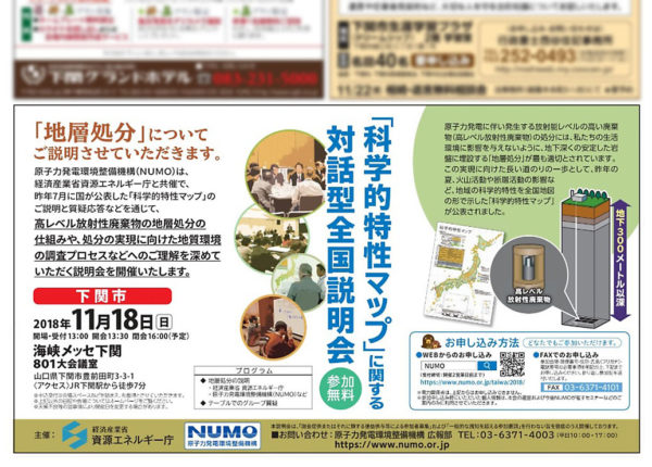 全国でおこなっている対話型説明会は、このNUMOの調査受け入れの素地をつくるものであり、注視すべき動きとなっている。下関市での説明会は、11月18日(日)午後1時30分から午後4時まで、海峡メッセ下関801大会議室でおこなわれる。主催は経済産業省資源エネルギー庁・原子力発電環境整備機構(NUMO)。事前の参加申し込みが必要となっている。
